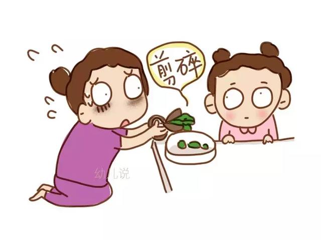 正确做法:鼓励孩子专心吃饭,吃饭时不要看电视,也不要玩玩具,养成专心吃饭的习惯。当孩子专心吃饭时,不仅能帮助孩子品尝出食物的味道,还能养成“一个时间内只做一件事”的做法。 4、食物总是剪得小小的或煮得烂烂的 有些家庭认为小朋友不爱吃饭,是因为食物太硬或蔬菜太长。所以很多家庭就特意把食物煮得软烂,蔬菜和肉食还用剪刀剪得小小的。事实上小朋友不想吃的常见原因不在此,即使大人经常把食物做得细细烂烂的,也不见得小朋友会爱上吃饭。 除此之外,如果小朋友已经超过2岁了,还经常以软烂、细碎的食物为主,将不利于孩子口腔咀嚼能力的发育,也不利于孩子语言的发展。这一点,幼儿说曾经有专文解释过。因为小朋友在学话时,想要发音准确清晰,就需要强壮的口腔肌肉和灵活地运作舌头。细烂的食物会妨碍了这一过程。