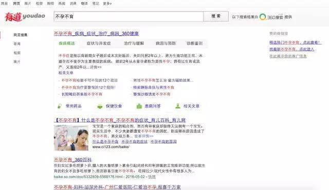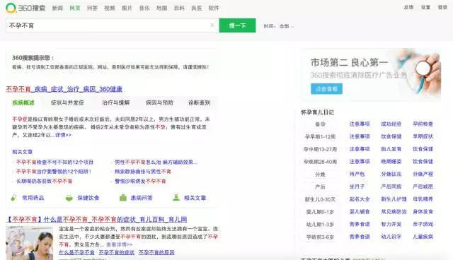 与此同时,其他搜索引擎可能由于害怕受到波及,也将这些推广内容下线了。尤其是已经喊出“彻底清除医疗广告业务”口号的360搜索,除了清除相关内容,甚至还会给出“看病、挂号请到工信部备案的正规医院、网站,否则医疗效果可能无法得到保障,请谨慎辨别!”提示。 当然,也不是搜索所有疾病都能在百度得到清爽干净的结果,目前还有不少词汇在做推广,比如“皮肤病”、“不孕不育”等词汇。我们现在就在百度、360搜索、有道搜索、搜狗搜索以及必应这五大搜索引擎中搜索“不孕不育”这个词看看到底都是些什么结果。 百度满屏推广,标签不明显 现在在百度搜索“不孕不育”,得到的结果是让人震惊的:不仅有推广,且整个首屏都是推广,占满了我的13.3英寸屏幕。这些推广看起来和普通信息几乎一模一样,只有小小的灰色“推广”二字可以加以区分。或许是百度还未来得及清理,或许是百度并未下定决定和医疗推广划清界限,但不管怎样,看到这样的结果,还真是让人挺抗拒的。 360搜索无推广,有提示 在360搜索“不孕不育”,首先十分显眼的绿色提示就让人觉得很靠谱。第一个结果是不孕不育相关卡片信息,点击详情进入的是360健康具体页面。第二个结果也是以科普信息为主。不过往下拉,就看到了一家民营医院的官网,这条信息不仅字体颜色字号和其他信息一样,连“推广”标签也没有。或许,这家医院的SEO真的很强吧。