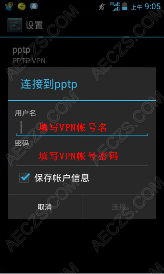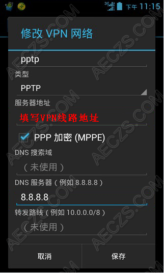 4、首次添加配置时,Android系统会要求输入一个验证密码,以验证配置或使用连接。这个设置一次即可,今后不用再设置。 5、填写PPTP设置选项,“名称”可以随意填写一个,“类型”选择PPTP,“服务器地址”填写VPN线路地址(<就是你购买的VPN地址>),勾选“启用PPTP加密”(根据服务商VPN线路设置而定,一般现在以需要加密的居多),然后勾选“显示高级选项”,在弹出高级选项设置里,“DNS服务器”填写8.8.8.8或留空。设置好后,点击保存完成创建,如下图: