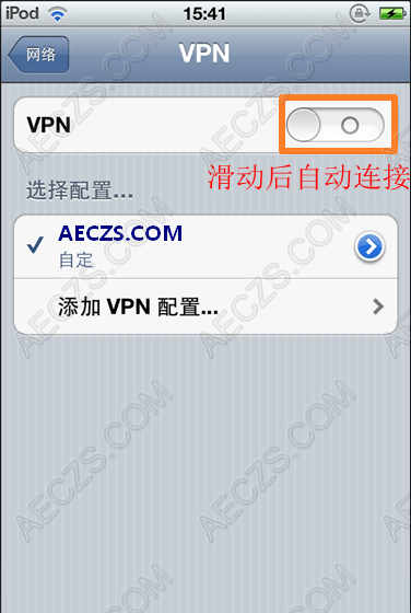 7、设置好后点击右上角的“存储”(参考上图),然后滑动“VPN”开关即可连接或关闭,连接上上面有个VPN图标。